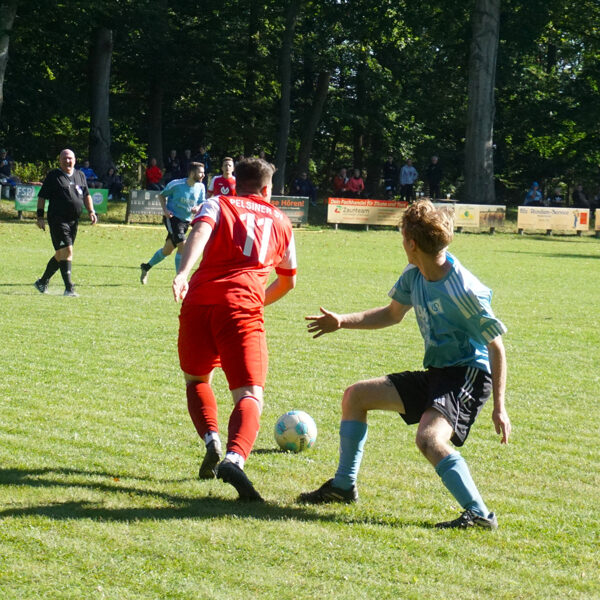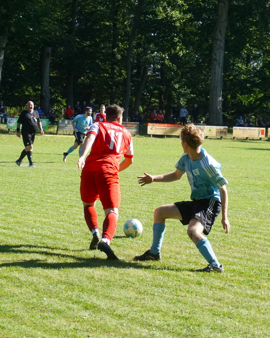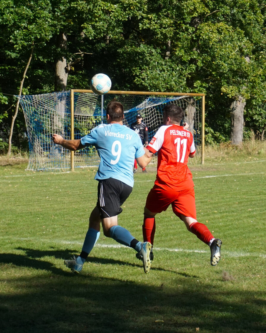 Für die Pelsiner war dies jedoch kein Grund, sich zurückzuziehen, sondern übernahm von Beginn an die Kontrolle des Spiels. Die Vierecker standen tief und wollten über schnelle Umschaltmomente Gefahr vor dem Pelsiner Kasten erzeugen. Dies gelang in der Anfangsphase zunächst selten, da die Pelsiner Defensive keine Durchbrüche der schnellen gegnerischen Angreifer zuließ. So hatte der PSV in der deutlich mehr Ballbesitz, fand jedoch noch nicht die richtigen Mittel, um den Vierecker Torwart in Bedrängnis zu bringen. Zudem unterbrach eine sehr kleinliche Linie des Schiedsrichters immer wieder einen echten Spielfluss. Nach knapp 20 Minuten war es dann eine Standardsituation, die die Gäste jubeln ließ. Paul Hirsch brachte eine Ecke von rechts an den Fünf-Meter-Raum, wo Geserick am höchsten stieg und das Spielgerät ins Netz zum 0:1 köpfte (19.). Viereck zeigte sich zunächst jedoch noch unbeeindruckt schaffte es wenige Minuten später erstmals mit einem langen Ball hinter die Pelsiner Abwehrkette. Kevin Müller konnte den Angreifer kurz vor dem eigenen Strafraum nur noch per Foul stoppen, was folgerichtig die gelbe Karte nach sich zog. Eine Notbremse war dies nicht, da Innenverteidiger-Kollege Dennis Reinke noch hätte eingreifen könnten. Den anschließenden Freistoß versenkte Vierecks Jonas Sy anschließend unter die Latte im Torwart-Eck zum 1:1-Ausgleich (22.). Auch die Pelsiner um Mannschaftskapitän Hendrik Netz ließen sich diesen Gegenschlag nicht anmerken und drängten weiter nach vorn. Erneut nur wenige Minuten später steckte Geserick zum von links in den Sechzehner ziehenden Bassam Fousseni durch, welcher den Ball flach neben den kurzen Pfosten im Tor zur erneuten Führung unterbrachte (25.). In der Folge strahlte Viereck lediglich über ruhende Bälle Gefahr aus, die die Defensive und Keeper Marvin Lüdemann allerdings immer wieder bereinigen konnten. Kurz vor der Pause konnten die Pelsiner die Führung sogar noch ausbauen. Hirsch schickt über rechts Mohammad in den Strafraum, der souverän am Torhüter vorbei zum 1:3 traf (40.).