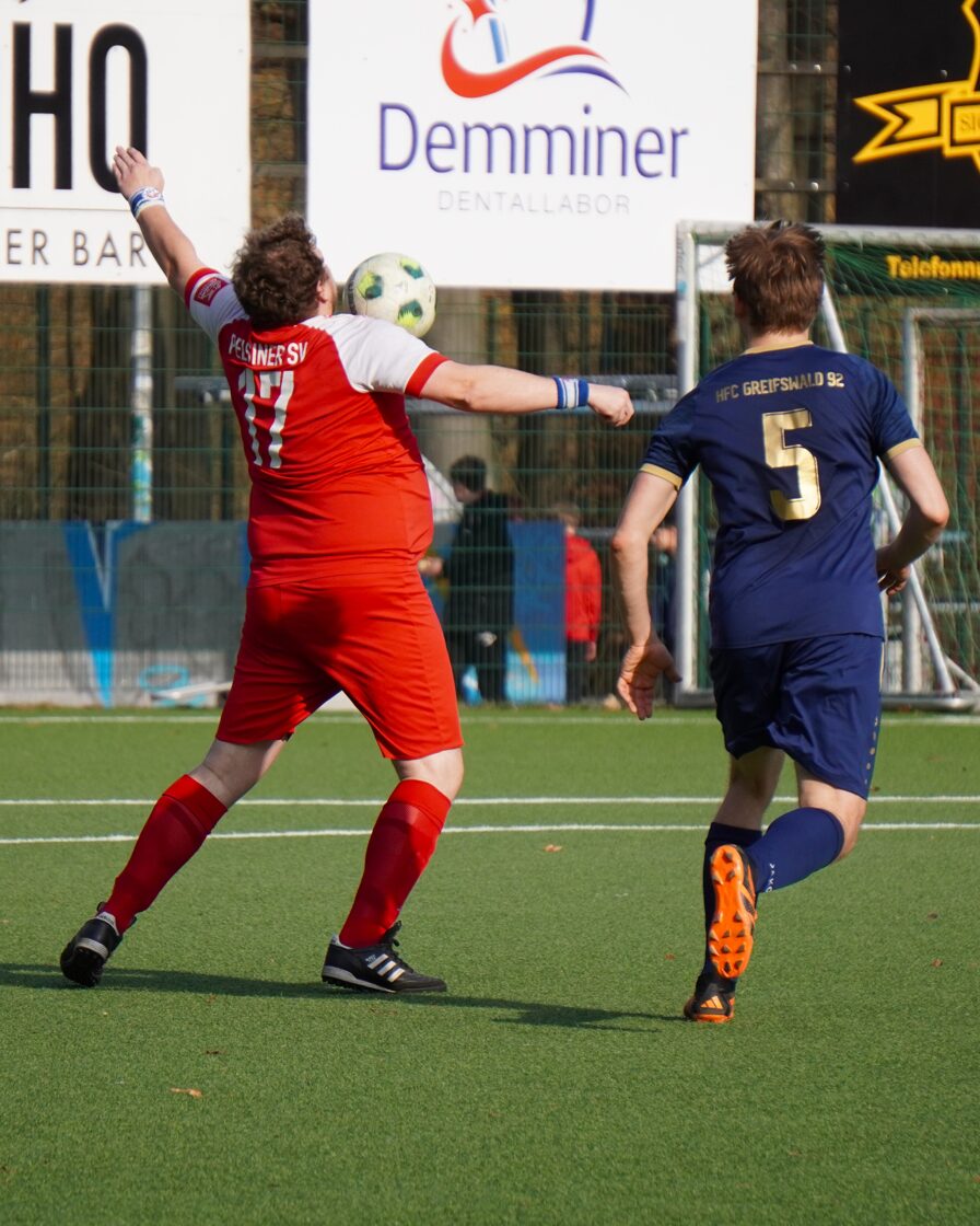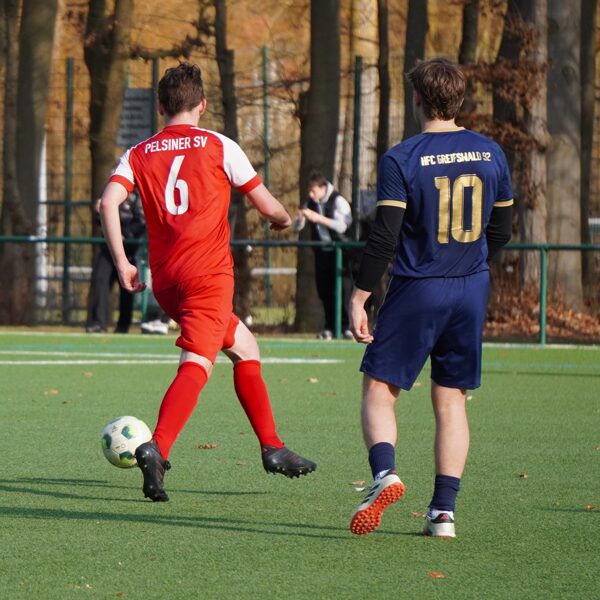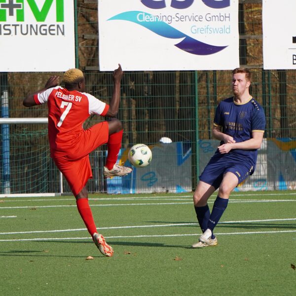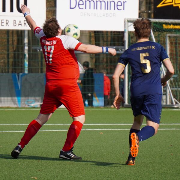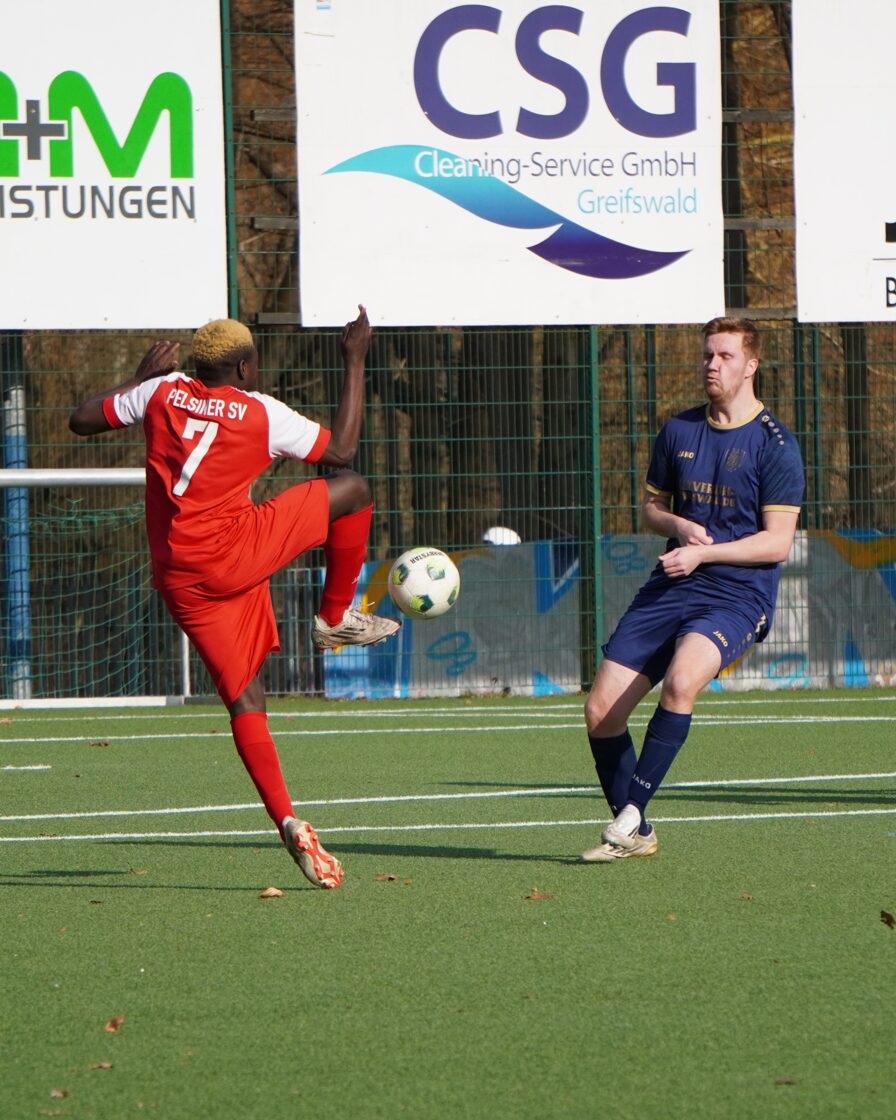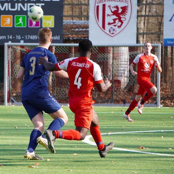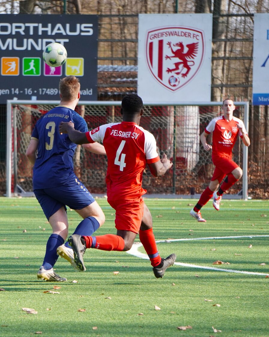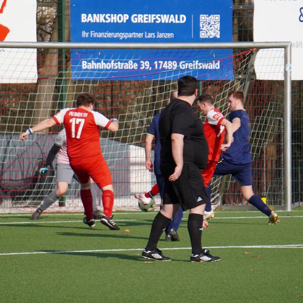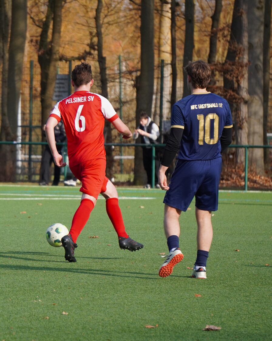 Im zweiten Spielabschnitt fanden die Pelsiner immer besser ins Spiel und konnten sich eine Vielzahl an guten Torchancen erarbeiten. Gleich dreimal stand die Querlatte dem nicht unverdienten Führungstreffer im Weg, ein Abstauber-Tor von Nico Wolframm wurde wegen angeblicher Abseitsposition beim Schuss von Herkules aberkannt und auch sonst war der Greifswalder Keeper regelmäßig zur Stelle. Die gastgebenden Hengste probierten es zwar immer wieder mit vertikalen Bällen in die Tiefe, die Innenverteidigung um Kevin Müller und Kapitän Hendrik Netz sowie in letzter Distanz Geserick unterbanden in der Regel jedoch die ganz große Torgefahr des Gegners. So blieb es unterm Strich beim 0:0-Unentschieden.