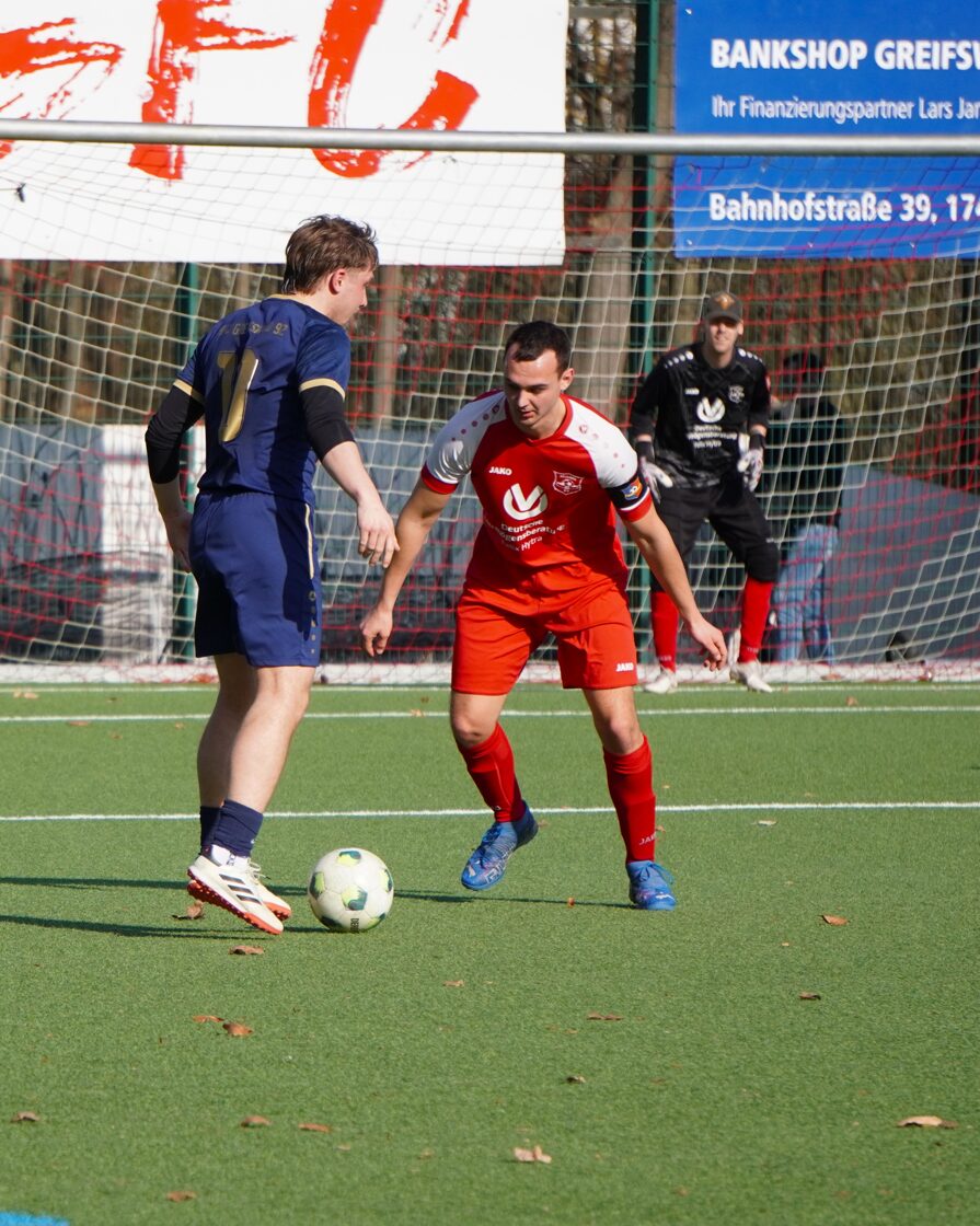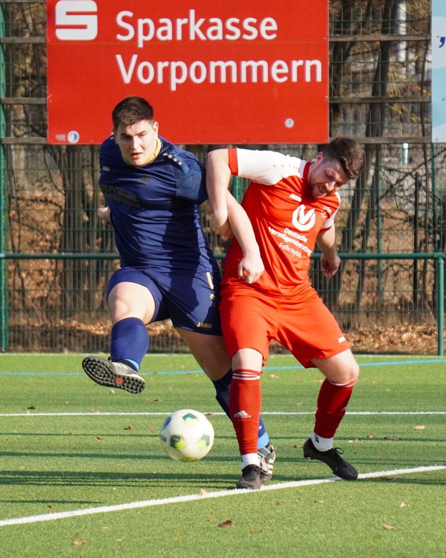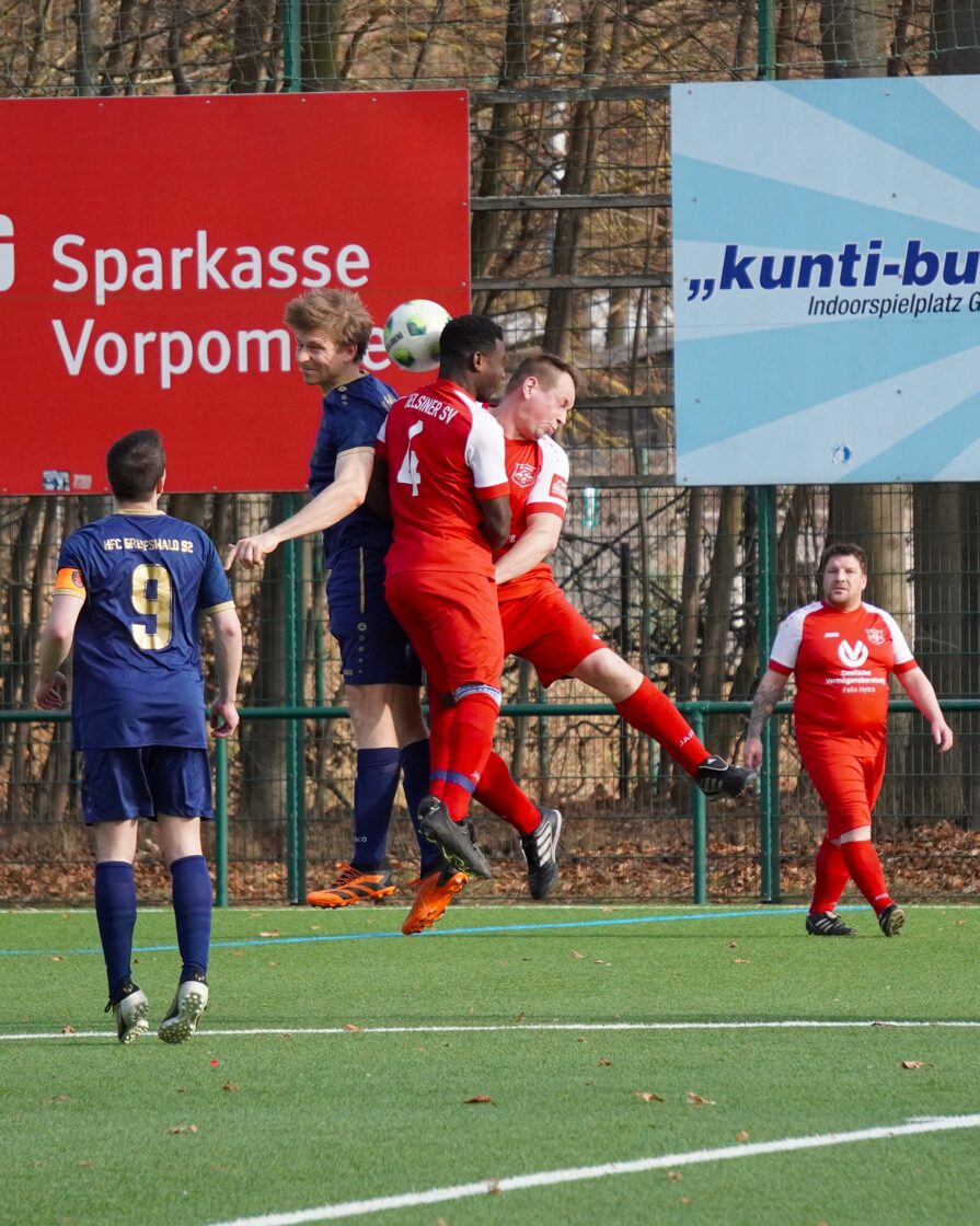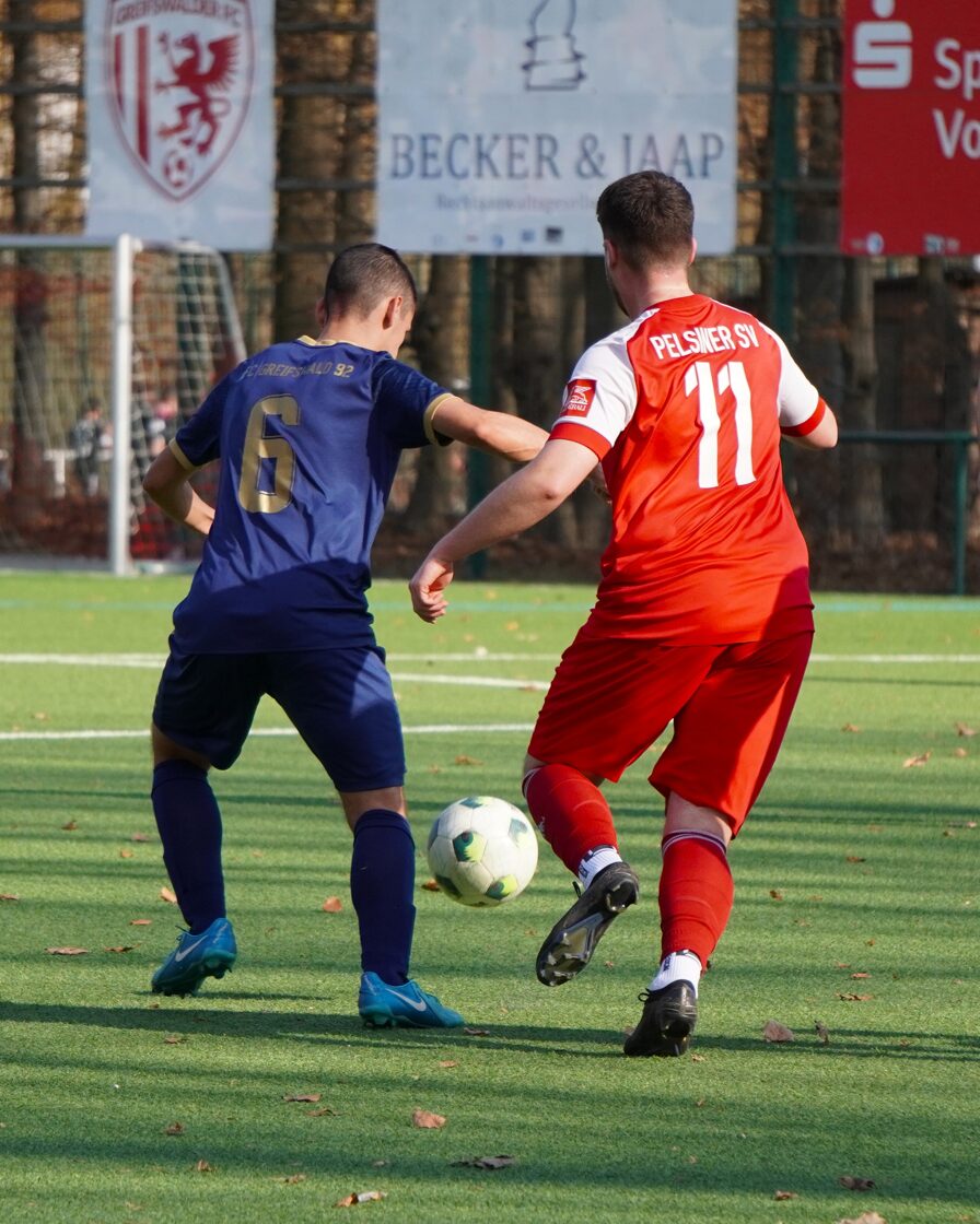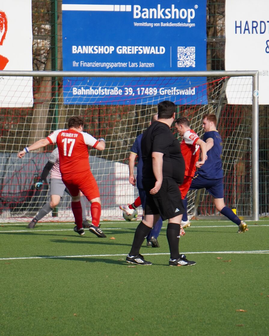 Im zweiten Spielabschnitt fanden die Pelsiner immer besser ins Spiel und konnten sich eine Vielzahl an guten Torchancen erarbeiten. Gleich dreimal stand die Querlatte dem nicht unverdienten Führungstreffer im Weg, ein Abstauber-Tor von Nico Wolframm wurde wegen angeblicher Abseitsposition beim Schuss von Herkules aberkannt und auch sonst war der Greifswalder Keeper regelmäßig zur Stelle. Die gastgebenden Hengste probierten es zwar immer wieder mit vertikalen Bällen in die Tiefe, die Innenverteidigung um Kevin Müller und Kapitän Hendrik Netz sowie in letzter Distanz Geserick unterbanden in der Regel jedoch die ganz große Torgefahr des Gegners. So blieb es unterm Strich beim 0:0-Unentschieden.